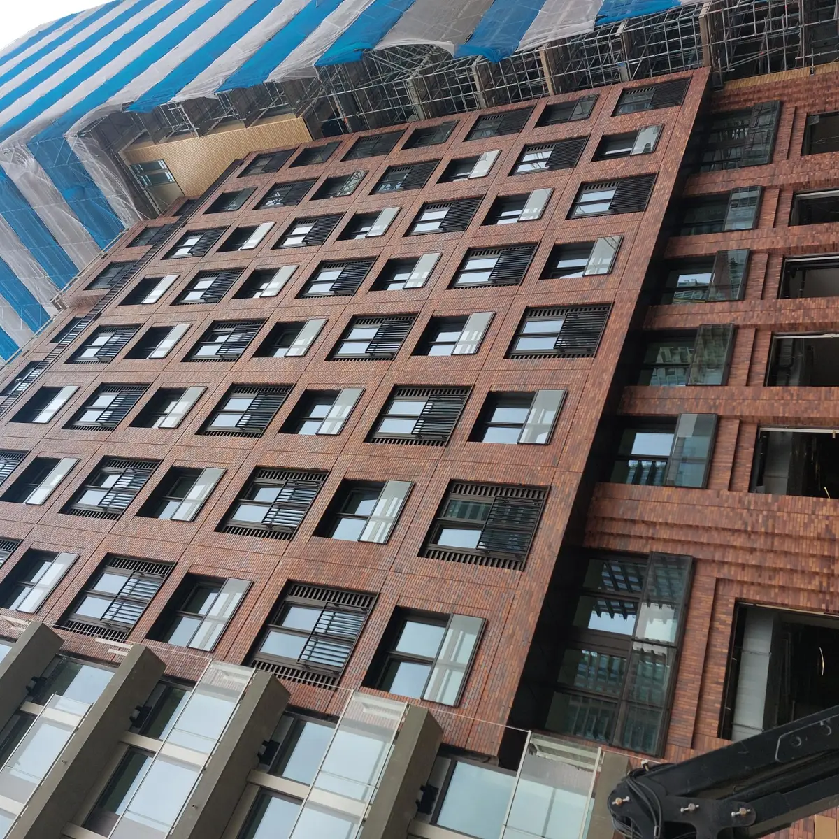 De gevel van blok B is gereed. Het metselwerk is klaar, al het glas en balkonschermen zijn geplaatst. Ook de aluminium beplatingen van buitenplafonds zijn gemonteerd.