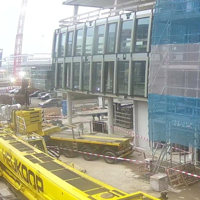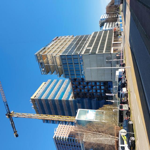 De steiger is hier inmiddels ook afgebroken, net als bij blok C, waardoor de mooie gevel zichtbaar is. Tijdens het afbreken van de steigers worden de balkons gemonteerd.