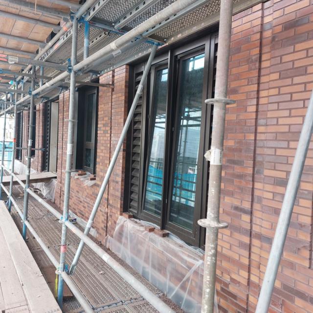 Het metselwerk van de achtergevel blok B is gereed. Hier zijn we de steiger aan het demonteren en tegelijkertijd plaatsen we de balkons, kant en klaar met de hekken er al op. De meeste woningen zijn van binnen inmiddels voorzien van tegelwerk in badkamer en toilet en zijn voorzien van spuitwerk op het plafond.