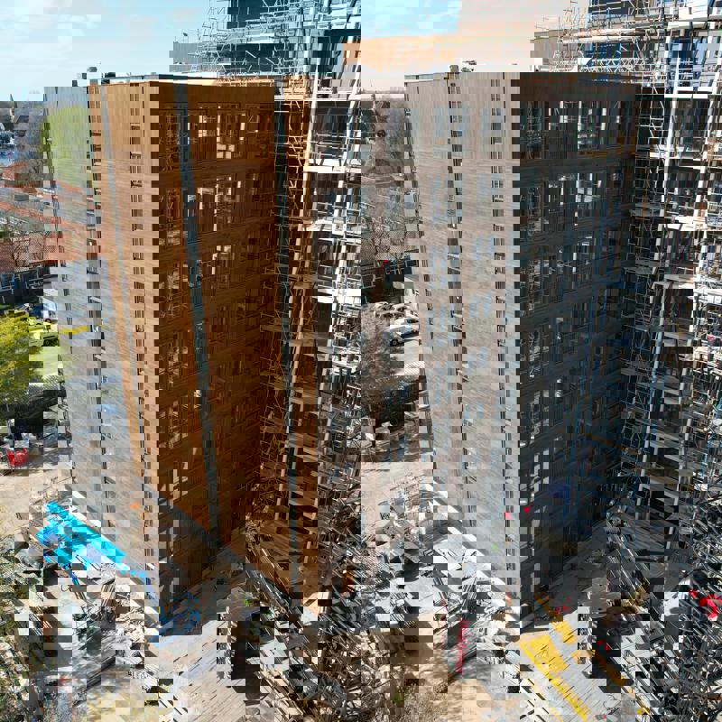 Vandaag is onder het toeziend oog van het projectteam, management en overige betrokkenen het hoogste punt bereikt van het project TIMBR, dat modulair wordt gerealiseerd aan de Slachthuisstraat in Zaandam. Met het plaatsen van het dak van de liftschacht werd, nadat afgelopen vrijdag de laatste module al was geplaatst, nu écht het hoogste punt bereikt. Daarbij werd het bouwpersoneel getrakteerd op een snack voor de lunch, waar heerlijk in het zonnetje van kon worden genoten.