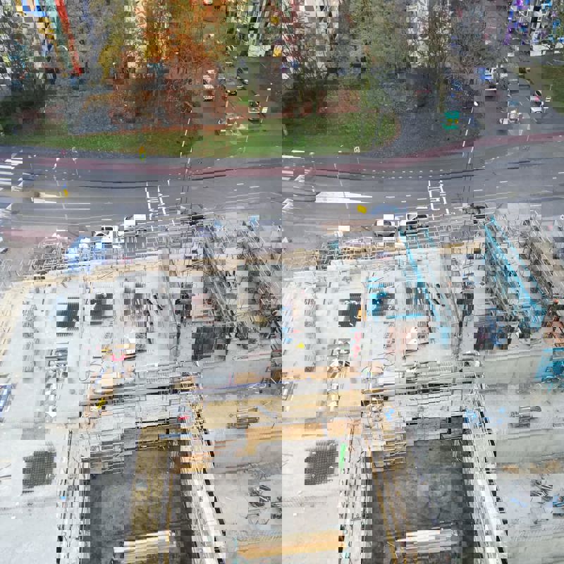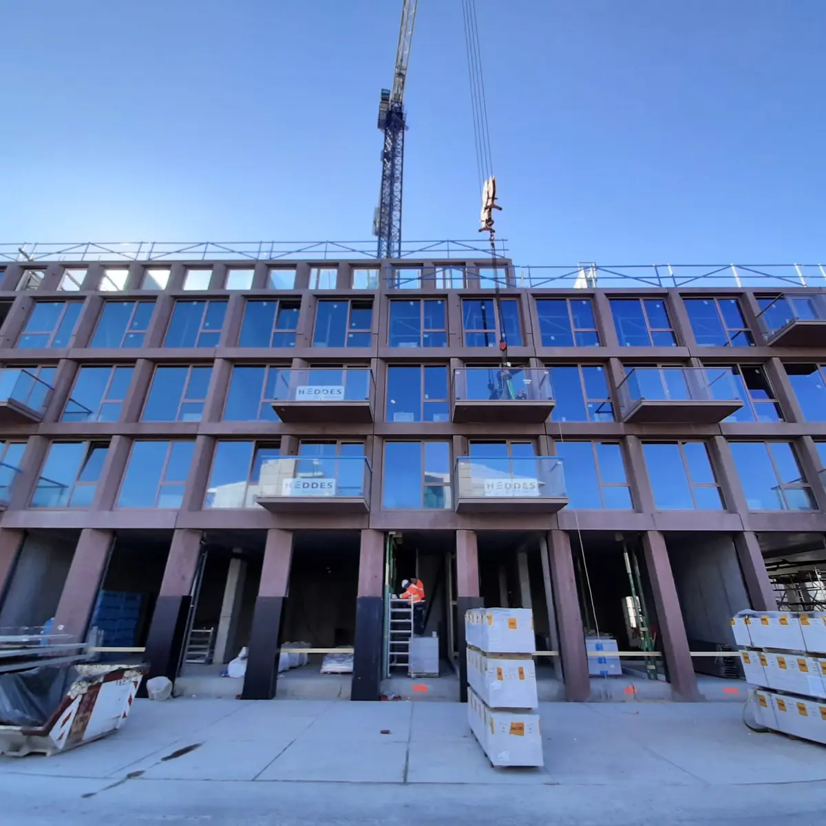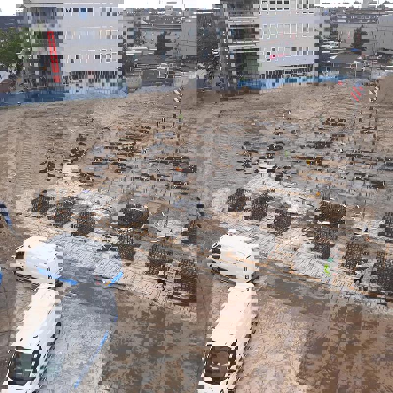 Door de toepassing van de veiligheidshekken aan de bovenzijde van de betonnen sandwichelementen is de veiligheid geborgd en kon er geheel steigerloos worden gewerkt. Nadat de gevelelementen geplaatst zijn kunnen de wanden, met stalen wandkisten, en de vloeren worden gestort. Zo kon de afbouw per verdieping snel van start gaan.