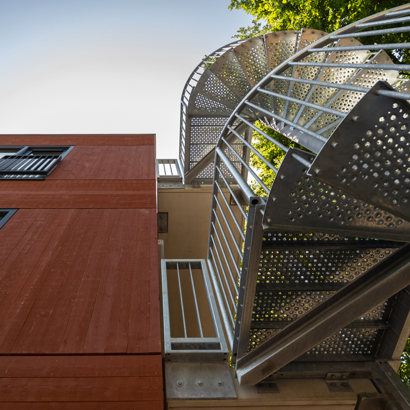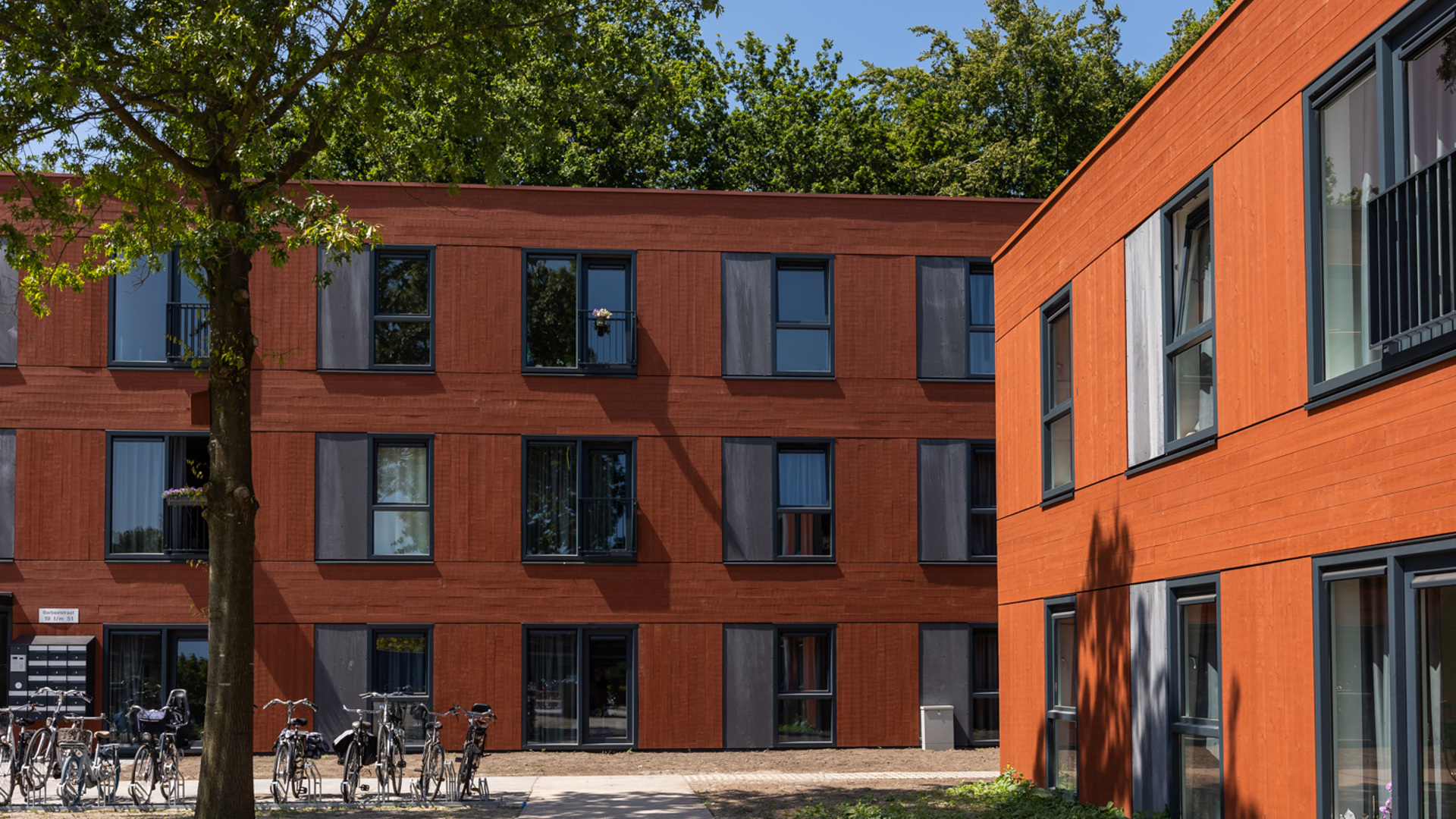 De gevel bestaat uit thermisch gemodificeerde houten panelen, geschilderd in een warmrode kleur die contrasteert met de vegetatie. De landschapsarchitectuur zal worden gebouwd met voornamelijk gerecyclede materialen en het regenwater van het dak zal lokaal worden geïnfiltreerd via een sloot langs de randen van het perceel.