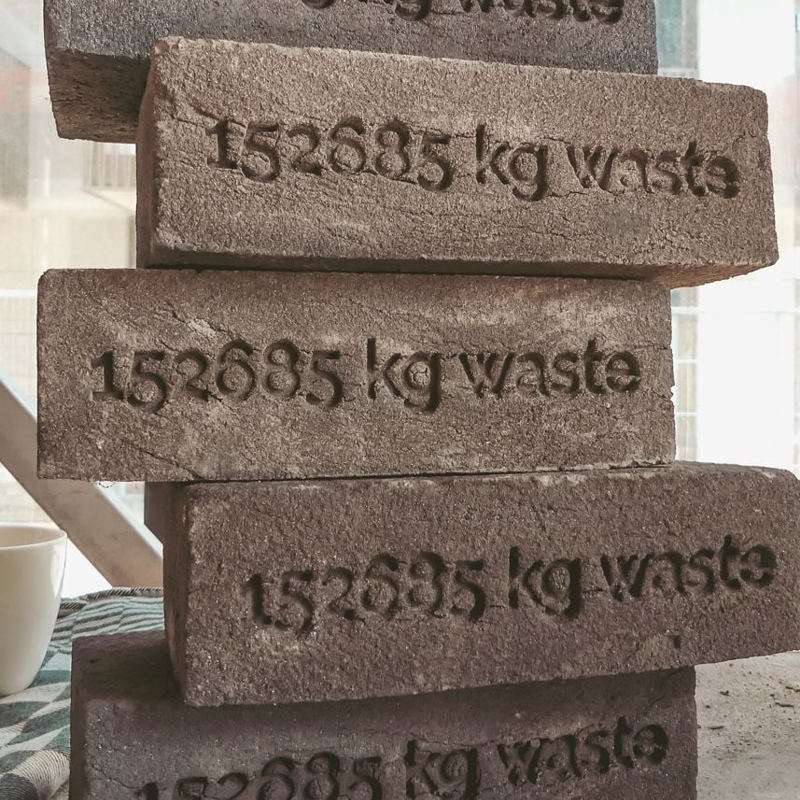 Voor de oplettende lezer: het getal in de ingemetselde bakstenen betreft het aantal ge-upcyclede kilo’s in de buitengevel en is exclusief de ruim 20.000 kilo die in het interieur is verwerkt.