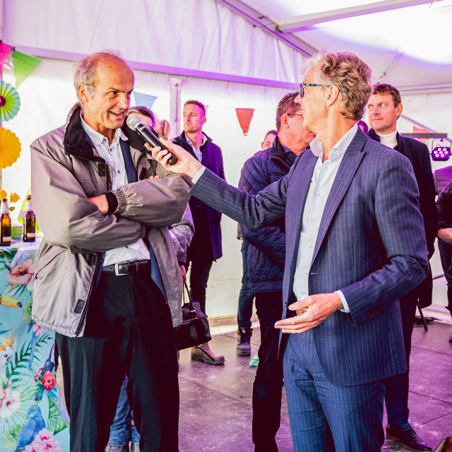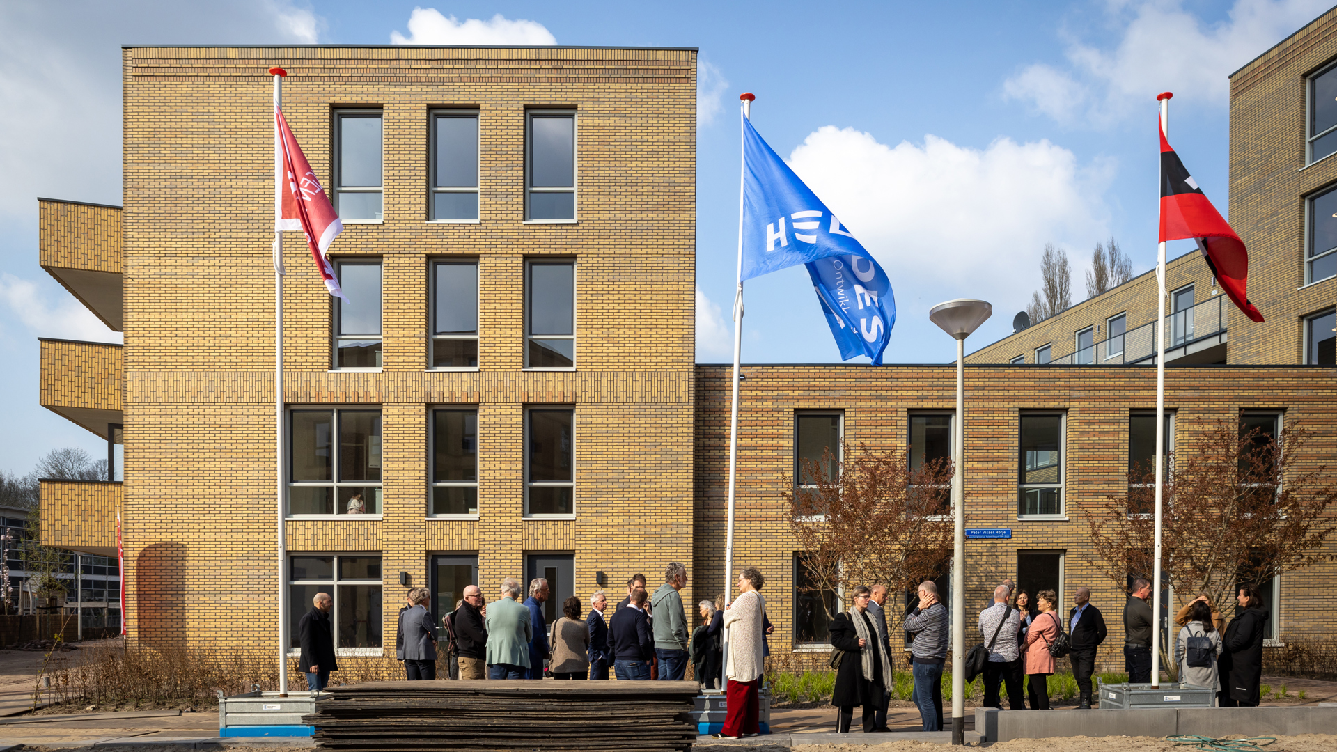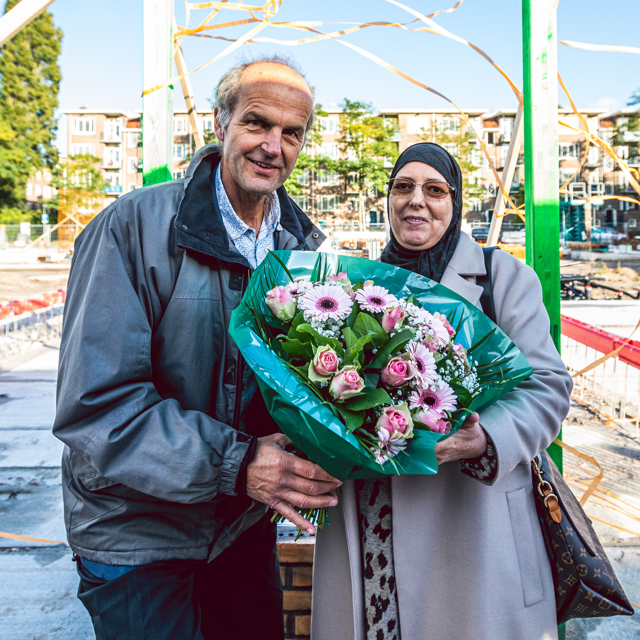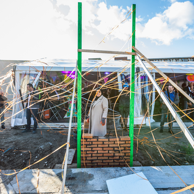 Op uitnodiging van opdrachtgever Eigen Haard kwamen betrokkenen op 12 oktober jl. naar de bouwplaats toe. Na een woord van welkom en toespraken van Bert Halm namens Eigen Haard, Carolien de Heer namens Stadsdeel Amsterdam West en Niels Doodeman namens Heddes Bouw & Ontwikkeling, was het tijd voor de symbolische handeling.
