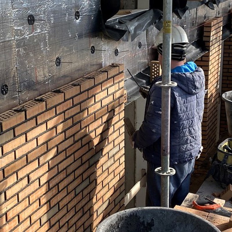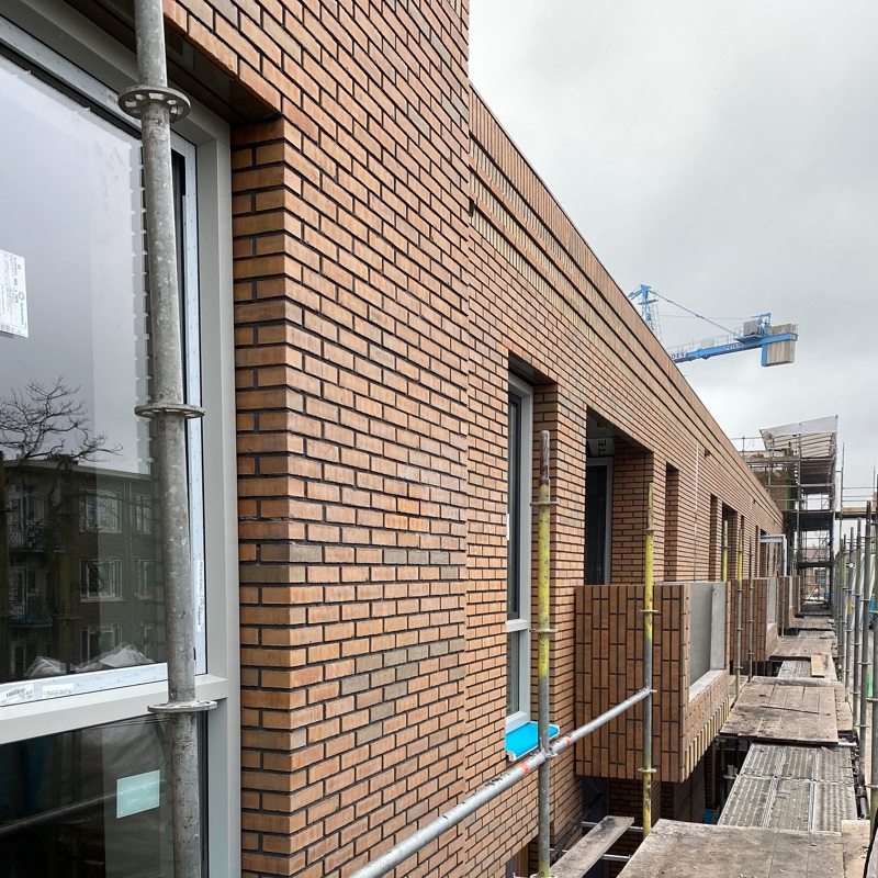 In maart 2022 is het metselwerk van blok F1 (Flierefluiter) bijna op hoogte. Ook zijn we hier op dat moment al goed op weg met de kunststof kozijnen die direct voorzien zijn van glas. Ondertussen is binnen de tegelzetter druk met de toiletten, badkamers en keukens. Ook de trappenhuizen zullen al betegeld worden.